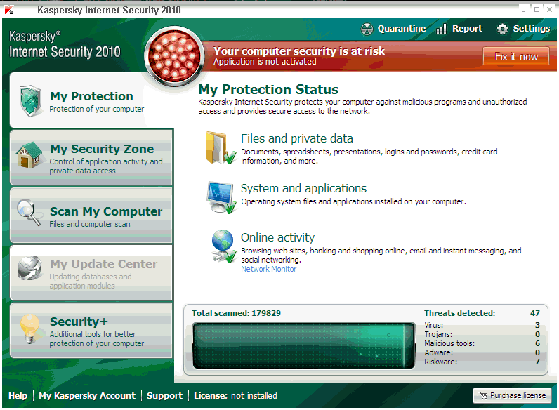 Kaspersky Internet Security 2010 is the backbone of your PCs security system, offering protection from a range of IT threats. Kaspersky Anti-Virus 2010 provides the basic tools needed to protect your PC.
