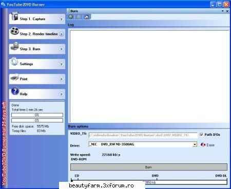 - Burn Data CD/DVD (CD R/RW, DVD+R/RW, DVD-R/RW, DVD DL, HD-DVD, Blu-Ray, etc.) - Autorun menu designer - Burn Audio CD (Import *.wav; *.mp3; *.ogg; *.mid; *.wma; *.aac; *.mp4; *.m4a; *.xm; *.mod; *.s3m; *.it; *.mtm; *.mo3 audio files.) - Burn Video DVD (Import AVI, DIVX, XVID, MP4, MPG, WMV, ASF, MOV, FLV, etc. Capture from Web cam, TV tuner, DV, etc.) - AudioCd Ripper - 100% freeware - no adware or spyware